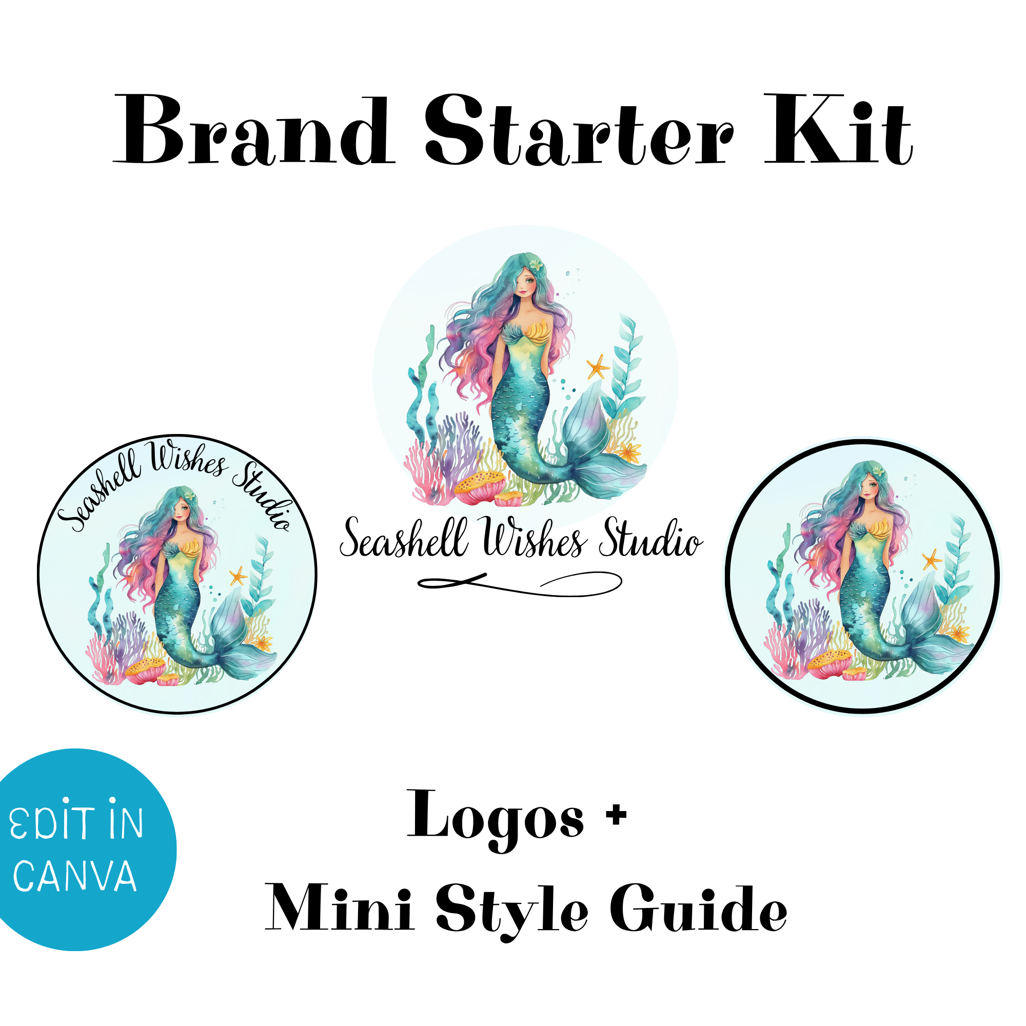 Mermaid Watercolor Logo Set Design, DIY Premade Editable Canva Template, Boutique Siren Coastal Ocean Small Business and Shop Branding Kit